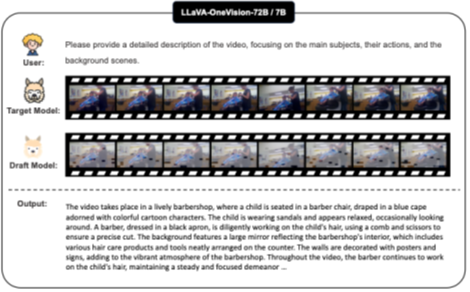 视频语言大模型由于巨量的模型参数和输入规模,在推理阶段面临性能挑战。本成果(SpecVLM)解决了现有加速技术固有的生成质量损失问题,实现了无损地加速视频语言大模型的推理。同时,本成果结合推测解码技术显著降低了解码延迟,实现了高推理加速比,为计算资源受限的应用场景赋能。