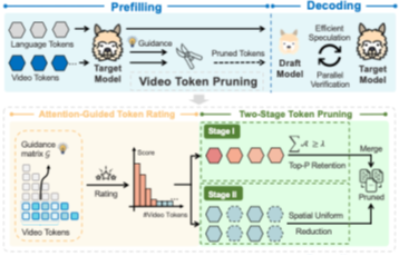 基于词元剪枝的推测解码增强框架。在预填充阶段,通过目标模型的注意力指导,为草稿模型实现视觉词元剪枝。在解码阶段,草稿模型高效地产生预测,由目标模型并行验证,保证原有的输出分布。剪枝模块具体步骤:首先基于目标模型的注意力矩阵,计算文本对视觉词元的平均注意力分数。此后,根据分数将输入词元划分为“高信息词元”和“低注意力词元”,采用两阶段剪枝方案。(i)高信息词元:根据注意分数的比例,采用Top-P法保留与输入相关的信息。(ii)低注意力词元:在空间上均匀地选择性保留,来保持一定的空间结构。