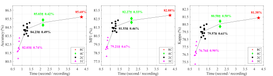 图2. 不同通道配置性能权衡曲线。该图展示了HANG7数据集上不同EEG通道配置(8C, 4C, 2C, 1C)下模型性能与推理时间的权衡关系。x轴表示每例全夜记录的推理时间,y轴表示性能指标(准确率、宏F1、Kappa系数)。结果显示通道数越多准确性越高,通道数越少推理速度越快。