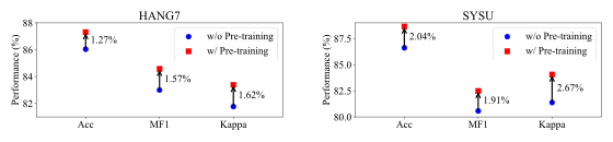 图1. 大规模预训练效果对比图。该图展示了有无大规模预训练对模型性能的影响对比。蓝色圆点代表仅在目标中心数据上训练的模型,红色方块代表经过公开数据集预训练后在目标中心微调的模型。结果显示预训练显著提升了模型在HANG7和SYSU数据集上的准确率、宏F1分数和Kappa系数。